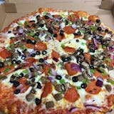Pepperoni, sausage, mushrooms, olives, bell peppers, onions.